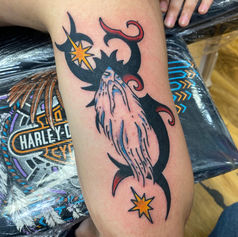 Harry Rogers pulls inspiration from the 80’s punk and metal, street culture, and comic-books imagery; blending it all into bold, solid, straight-up powerful tattoos.