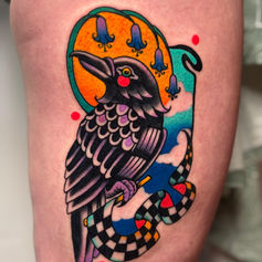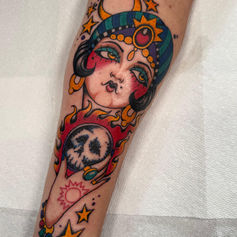 bold & colourful traditional inspired work with a psychedelic twist. She loves making the classics too - so if you fancy something traditional and unique, she’s your girl!